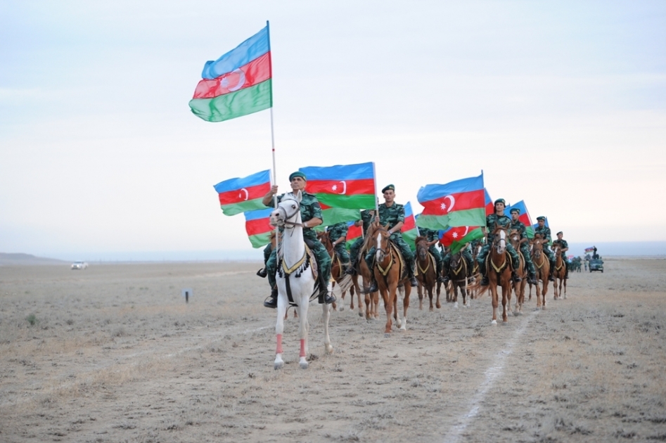 Ahead of the march border guard riders on Karabakh horses proudly raised Azerbaijan’s sacred flag over their heads.
