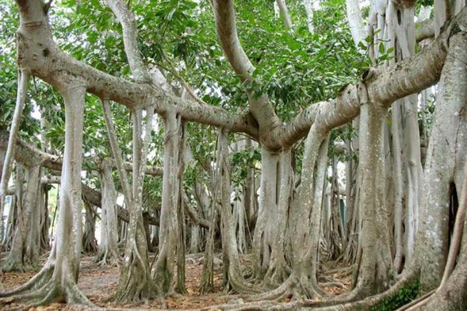 Многие на фотографиях видят не одно растение, а целый их лес, хотя это и ошибочно. Дело в том, что для этого фикуса (Ficus benghalensis) характерна особенная форма жизни - баньян. Фикус образует мощные ветки, с которые вниз отрастают побеги или "воздушные" корни. Большая часть из них засыхает, так и не достигнув земли, более же успешные укореняются, образуя новые колонны-стволы. Произрастает это растение в Индии, Шри-Ланке и Бангладеше. Дерево в итоге может так разрастись, что займет несколько гектаров.