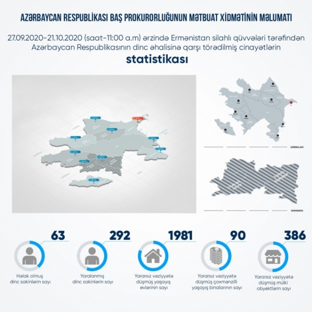 • Число погибших среди гражданского населения в результате обстрела вооруженными силами Армении населенных пунктов Азербайджана из тяжелых артиллерийских установок и ракетных систем с 27 сентября до 11:00 часов 21 октября достигло 63, а пострадавших – 292. Пришли в негодность 1981 дом, 90 многоквартирных зданий и 386 гражданских объектов. Информацию об этом распространила Генеральная прокуратура Азербайджанской Республики.