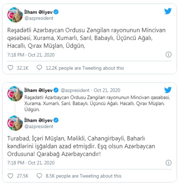 • Освобождены от оккупации поселок Миндживан и 13 сел Зангиланского района – Хурама, Хумарлы, Сарыл, Бабайлы, Учунджю Агалы, Гаджаллы, Гырах Мюшлан, Удгюн, Турабад, Ичери Мюшлан, Меликли, Джахангирбейли, Бахарлы. Об этом в своем аккаунте в Twitter сообщил Президент Ильхам Алиев.