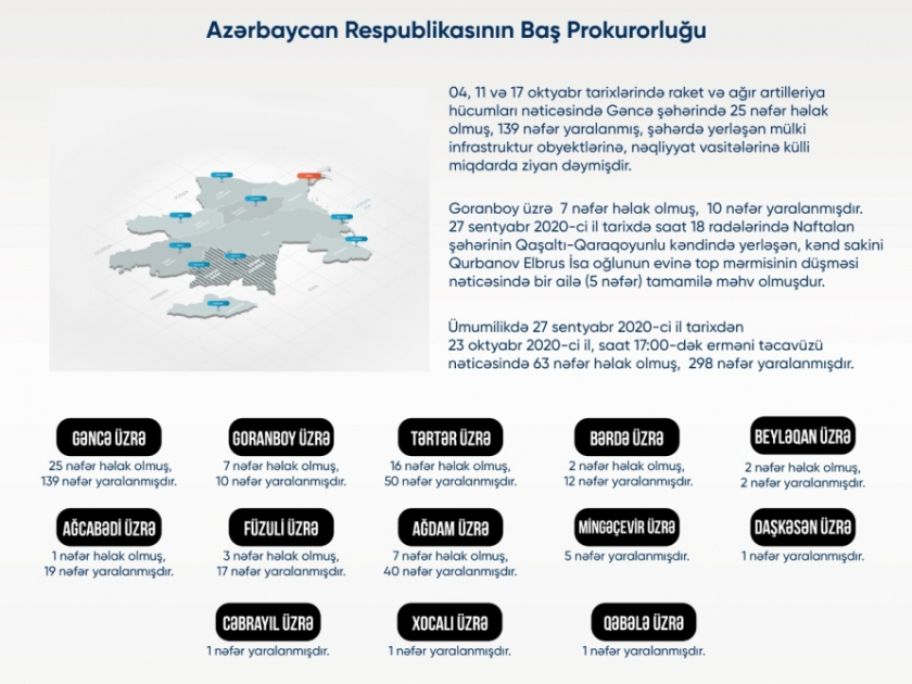 • По данным Генеральной прокуратуры Азербайджана, число погибших среди гражданского населения в результате обстрела вооруженными силами Армении наших населенных пунктов из тяжелых артиллерийских установок и ракетных систем с 27 сентября по состоянию на 12:00 часов 23 октября достигло 63, а пострадавших – 298, нанесен ущерб 2156 домам, 90 многоквартирным зданиям и 398 гражданским объектам.