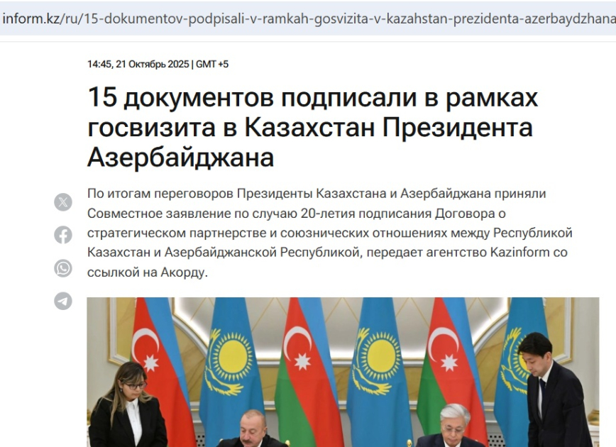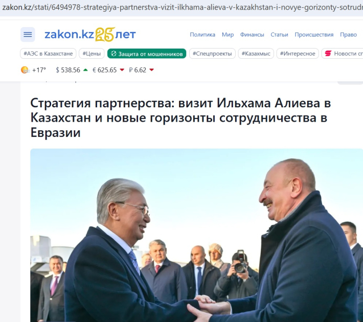 В публикации, размещенной на Baq.kz, отмечается, что государственный визит Президента Азербайджана Ильхама Алиева в Казахстан стал важным этапом в развитии стратегических отношений между двумя странами.