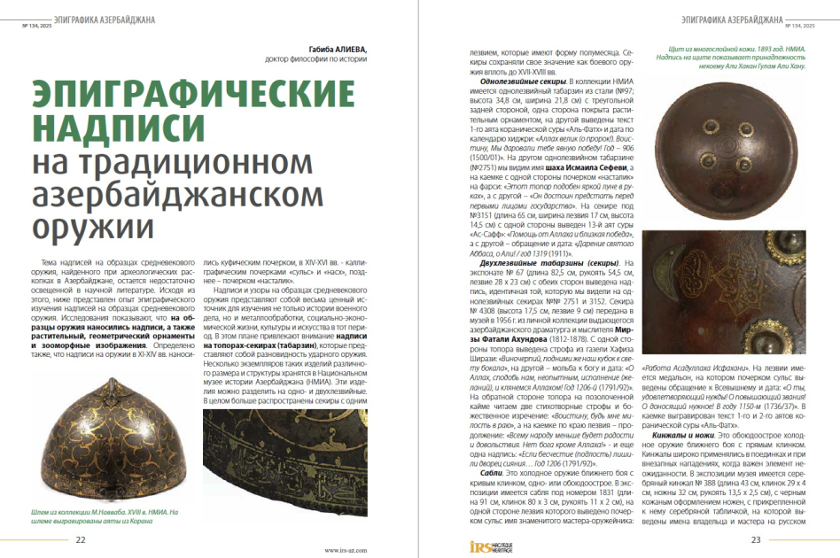 Другой материал номера посвящен эпиграфическим надписям на средневековом азербайджанском оружии. В нем описаны орнаменты, изображения и надписи религиозного содержания, отмечена их роль для изучения общественных отношений и искусства прошлого.