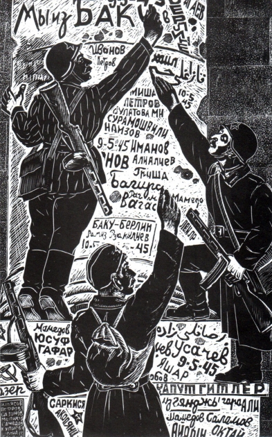 Azərbaycan rəssamlarının alman faşistlərini tənqid edən plakat və karikaturalarına döyüş cəbhələrində də rast gəlmək olardı. Müharibə illərində Bakının bir neçə yerində (Neft-yağ zavodunun, Nizami muzeyinin və indiki Maliyyə Bazarlarına Nəzarət Palatasının binası qarşısında) yaradılan “Təşviqat pəncərəsi” guşələrində rəssamların müharibə mövzusunda əsərləri vaxtaşırı göstərilirdi. Azərbaycan rəssamlarının yaradıcılığının arxa və ön cəbhədə böyük mənəvi-psixoloji təsiri barədə məlumatlar Moskvaya qədər gedib çıxmışdı. Rəssamlarımızın fəaliyyətini yüksək dəyərləndirən Kreml ideoloqlarının 1943-cü ildə Moskvadakı Dövlət Tretyakov Qalereyasında onların sərgisinin təşkilinə qərar vermələri də bu təqdirin ifadəsi olmuşdu...