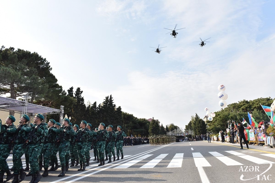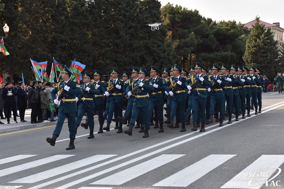 Hərbçilərdən sonra meydana “Şahin” idman oyununun qalibləri daxil olublar. Onları şəhərdə fəaliyyət göstərən tam orta məktəblərin yuxarı sinif şagirdləri əvəz edib.