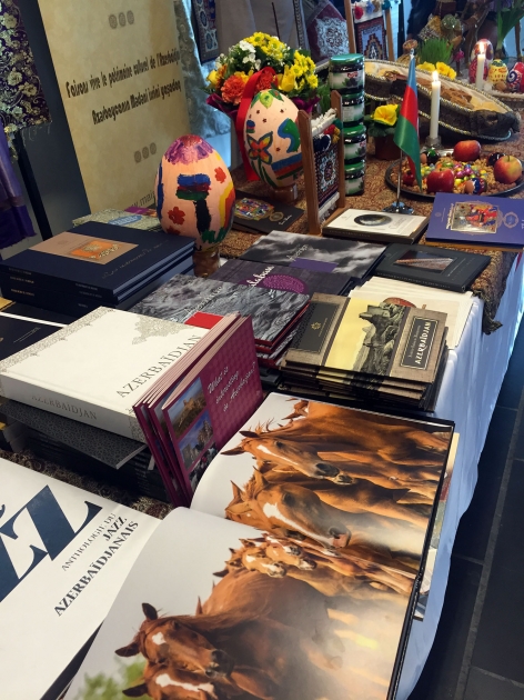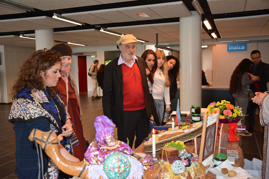 Novruz bayramı xonçaları ilə bəzədilmiş Azərbaycan stendində Heydər Əliyev Fondunun ölkəmizin tarixi, mədəniyəti və incəsənətinə dair kitabları, broşürləri və digər müxtəlif nəşrləri təqdim olunub. Çay dəstgahı, musiqi alətləri, kiçik həcmli xalçalar, milli ornamentli suvenirlərlə bəzədilmiş stendimiz institut kollektivinin diqqətini cəlb edib.