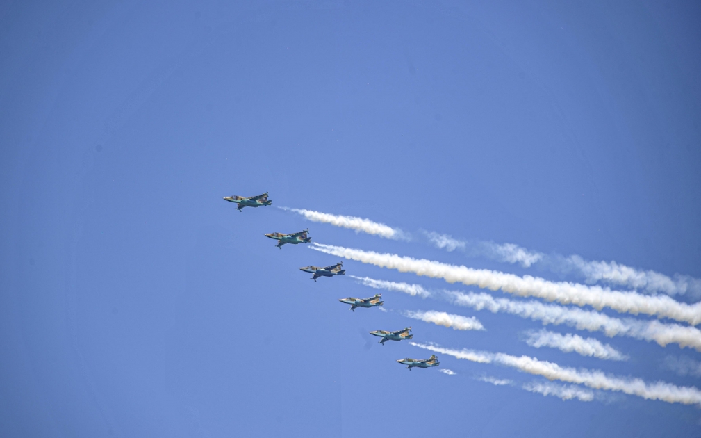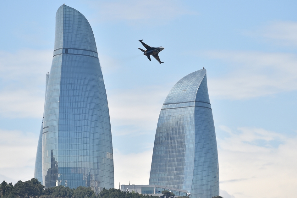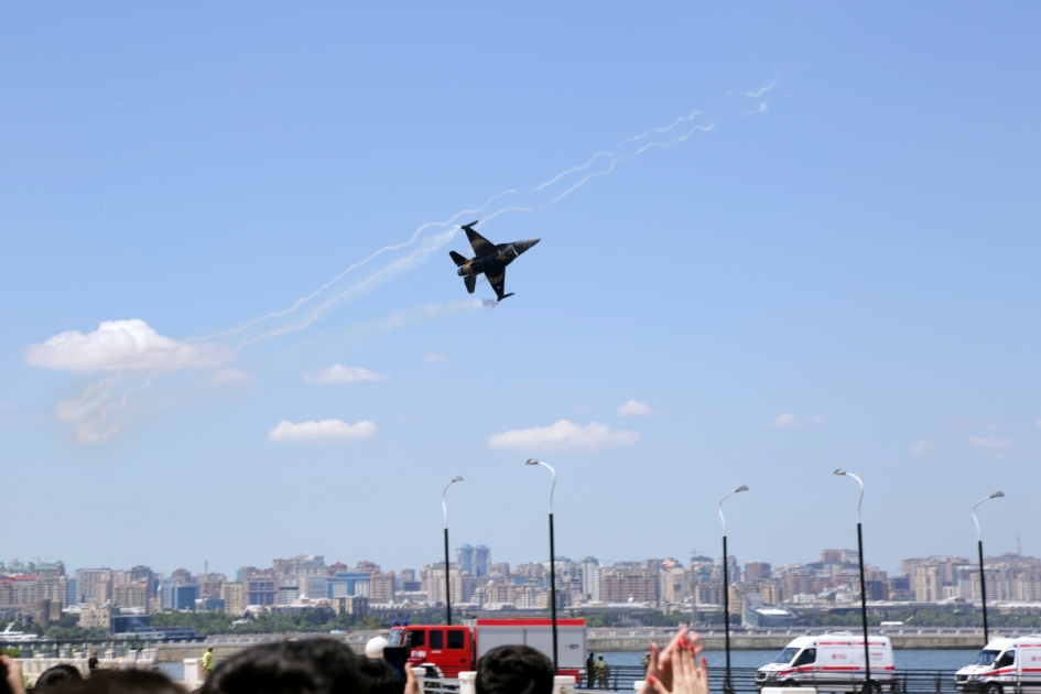 Azərbaycan Hərbi Hava Qüvvələrinin Su-25 və MİQ-29 qırıcı təyyarələri, hərbi helikopterlər və qardaş Türkiyənin “Solo Türk”, “Türk Ulduzları”, “HÜRKUŞ” aerobatika komandaları, “ATAK” helikopterləri və “Akıncı” PUA-sı ilə nəfəs kəsən hava şousu təqdim ediblər. Milli şahinlərimiz də qardaş Türkiyənin pilotları ilə yanaşı, mürəkkəb manevrlərin öhdəsindən layiqincə, cəsarətlə, qətiyyətlə gəlib və bu dəfə də tamaşaçıları valeh ediblər.