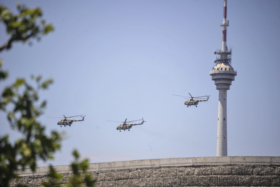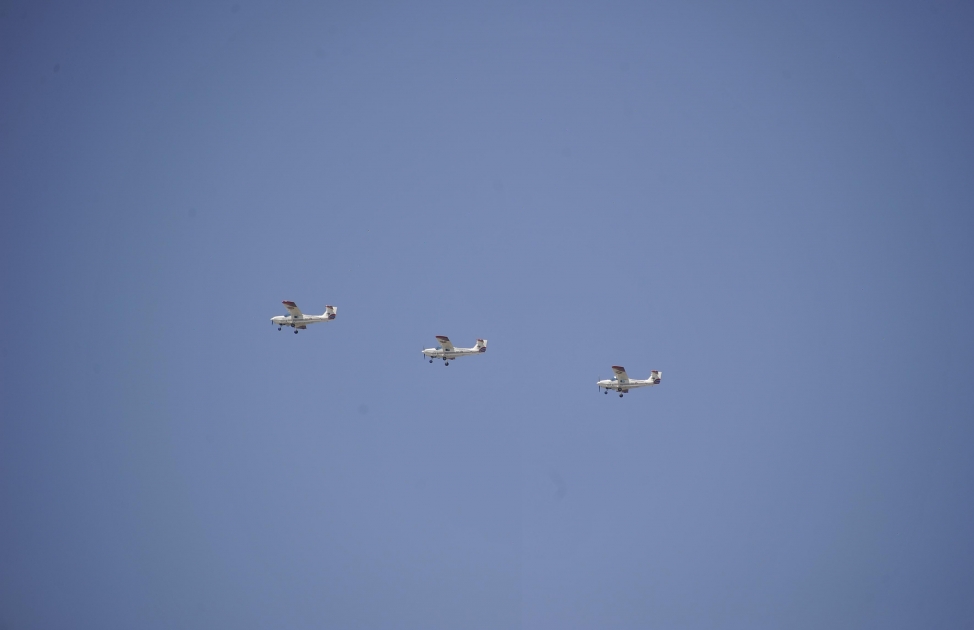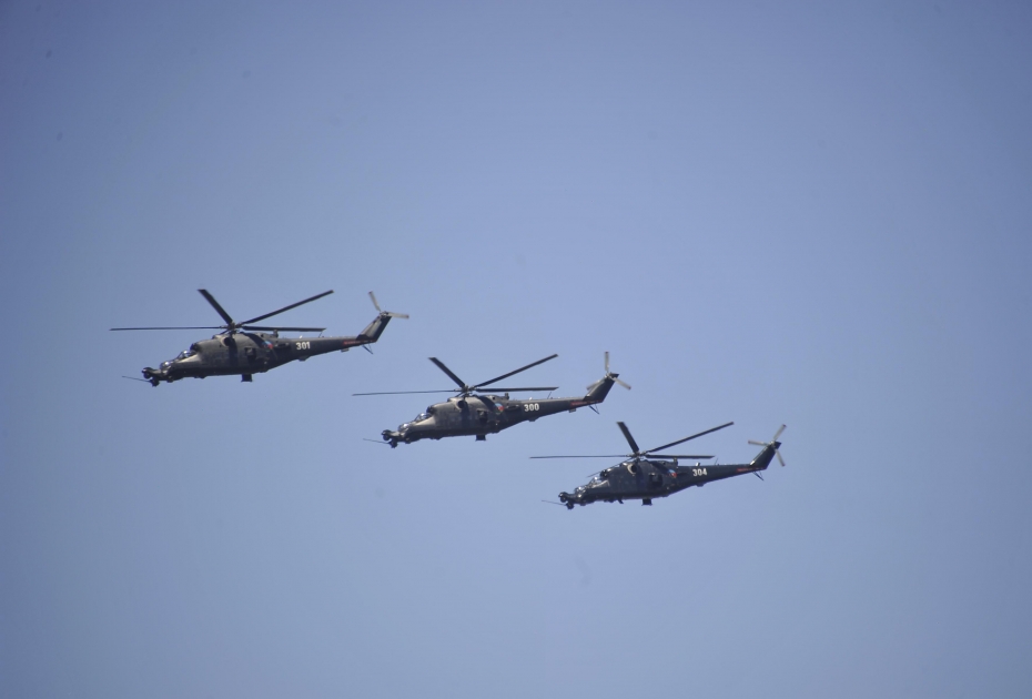 Sonra Mİ-24 helikopterləri üçlüyü, MFİ-17 (“Super Muşşaq”) təlim təyyarələrindən ibarət üçlük, aviabazalarda təyyarəçilərin uçuş qabiliyyətinin daim yüksəldilməsinə xidmət edən reaktiv mühərrikli L-39 təlim təyyarələri üçlüyü, hava məkanında aviasiyanın hakimliyini qoruyub saxlayan, hücum təyyarələrini və digər quru qoşun birləşmələrinin havadan qorunması və himayəsində müstəsna rol oynayan çoxməqsədli, səsdən iti MİQ-29 qırıcı təyyarələr üçlüyü, yerüstü hədəflərə dağıdıcı zərbələr endirən hücumçu SU-25 təyyarələr qrupu öz nümunəvi uçuşları ilə tamaşaçıları salamlayıb.