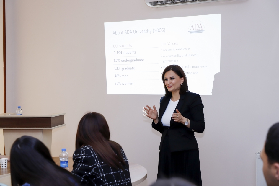 Aygün Hacıyeva idarə əməkdaşlarını ADA Universitetinin və onun nəzdində fəaliyyət göstərən İnkişaf və Diplomatiya İnstitutunun fəaliyyət istiqamətləri və həyata keçirdiyi proqramlar barədə məlumatlandırıb.