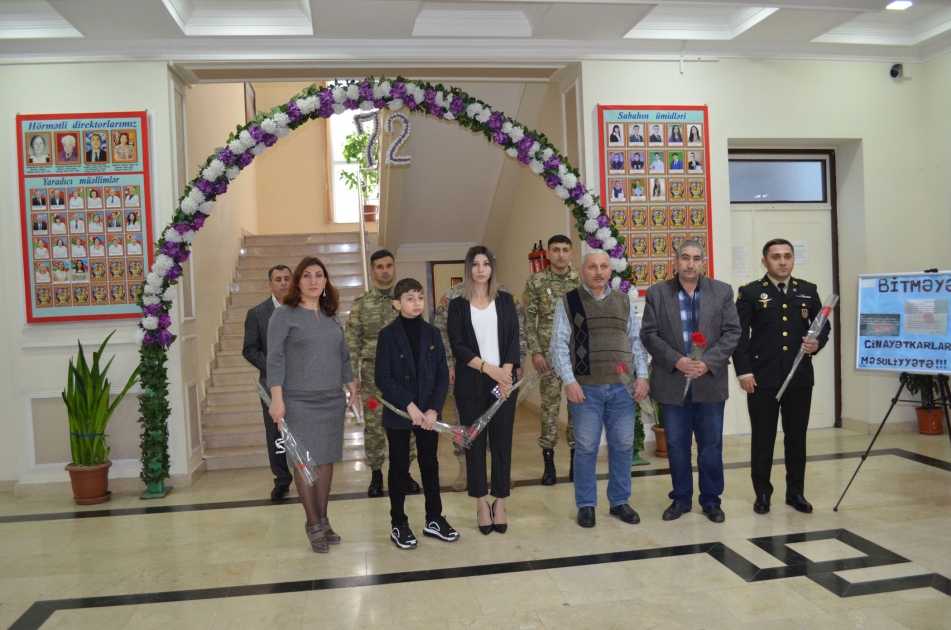 Azərbaycan Ordusunun zabiti mayor Anar Rzayev şagirdlərlə görüşdə bildirib ki, şəhidlərimizin xatirəsinin əbədiləşdirilməsi, onların vətənpərvərliklərinin və qəhrəmanlıqlarının təbliği, məktəblilərdə hərbi-vətənpərvərlik ruhunun yüksəldilməsi məqsədilə “Şəhidlər unudulmur” layihəsi icra olunur. Layihə çərçivəsində orta ümumtəhsil məktəblərinin ən qabaqcıl siniflərinə şəhidlərimizin adları verilir. Bu siniflərdə yaradılacaq guşələrdə Azərbaycanın müstəqilliyi və ərazi bütövlüyü uğrunda canlarından keçmiş qəhrəman Vətən övladlarının xatirəsinin əbədiləşdirilməsi, məktəblilərin şəhidlərimizin vətənpərvərliyi və qəhrəmanlığı barədə ətraflı məlumatlandırılmaları barədə davamlı və genişmiqyaslı iş aparılacaq. Bildirilib ki, layihə çərçivəsində 72 nömrəli məktəb-liseyin də dörd sinif otağına şəhidlərimizin adları verilib.