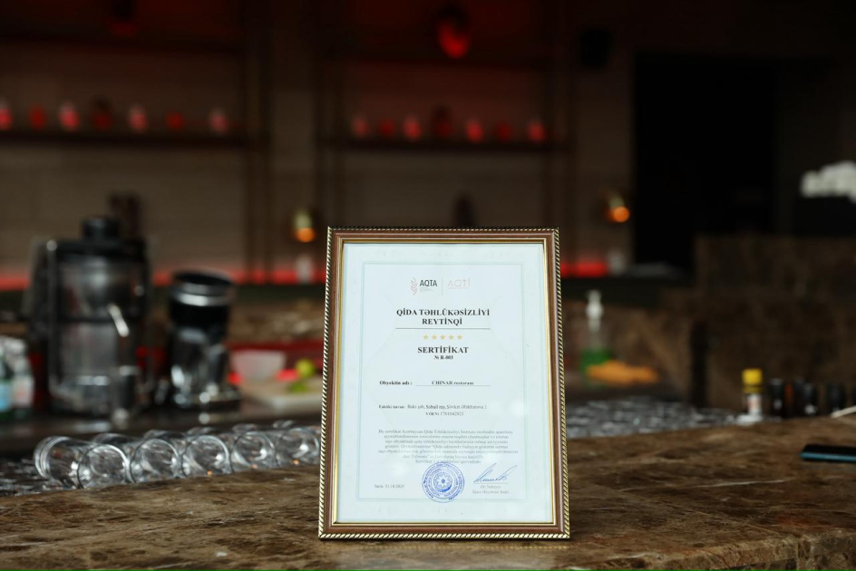 Azərbaycan Qida Təhlükəsizliyi İnstitutu (AQTİ) tərəfindən həyata keçirilən “Ulduz-reytinq” layihəsi çərçivəsində “Chinar” restoranında qiymətləndirmə aparılıb. Nəticələrə əsasən, müəssisədə qida təhlükəsizliyi tələblərinin yüksək səviyyədə tətbiq olunduğu müəyyən edilib və restorana “5 ulduz” sertifikatı təqdim olunub.