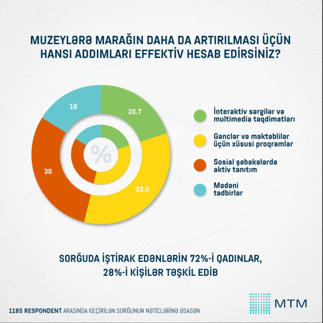 AZƏRTAC MTM-yə istinadla xəbər verir ki, respondentlərin 72,6 faizi muzeylərə yüksək maraq göstərdiyini bildirib. Bu göstərici onu deməyə əsas verir ki, muzeylər artıq yalnız “keçmişi qoruyan səssiz məkanlar” kimi qəbul edilmir. Cəmiyyət onları bilik, düşüncə və identiklik formalaşdıran canlı platformalar kimi görür. Sürətli informasiya axını şəraitində insanların daha dərin, etibarlı və konteksti olan mənbələrə üz tutması bu marağın əsas səbəblərindən biridir.
