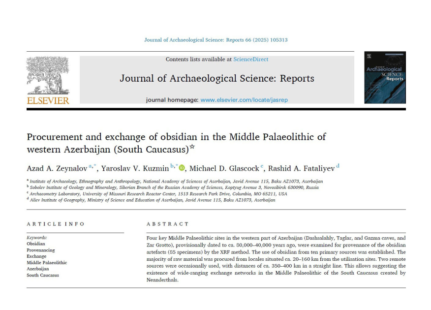 Niderlandın ingilisdilli “Arxeologiya elmi jurnalı: hesabatlar” nəşrinin son nömrəsində “Qərbi Azərbaycanın (Cənubi Qafqazın) Orta Paleolit dövründə obsidianın əldə edilməsi və mübadiləsi” adlı tədqiqat məqaləsi dərc olunub. Məqalənin müəllifləri sırasında AMEA Arxeologiya və Antropologiya İnstitutunun aparıcı elmi işçisi tarix üzrə fəlsəfə doktoru Azad Zeynalov, Elm və Təhsil Nazirliyinin akademik Həsən Əliyev adına Coğrafiya İnstitutunun aparıcı elmi işçisi geologiya-mineralogiya üzrə fəlsəfə doktoru Rəşid Fətəliyev də yer alır.