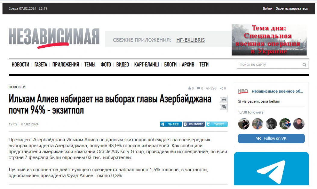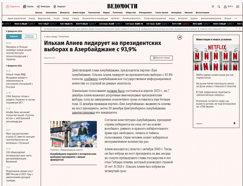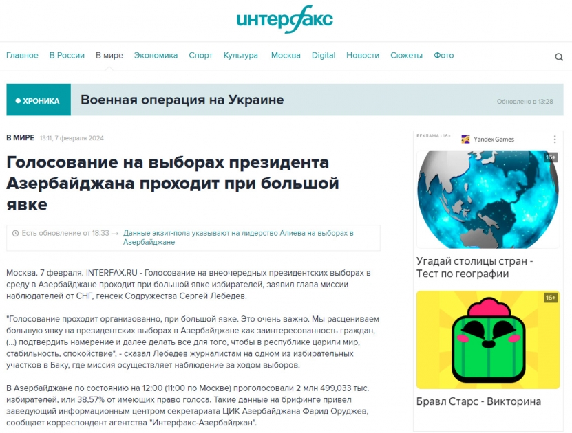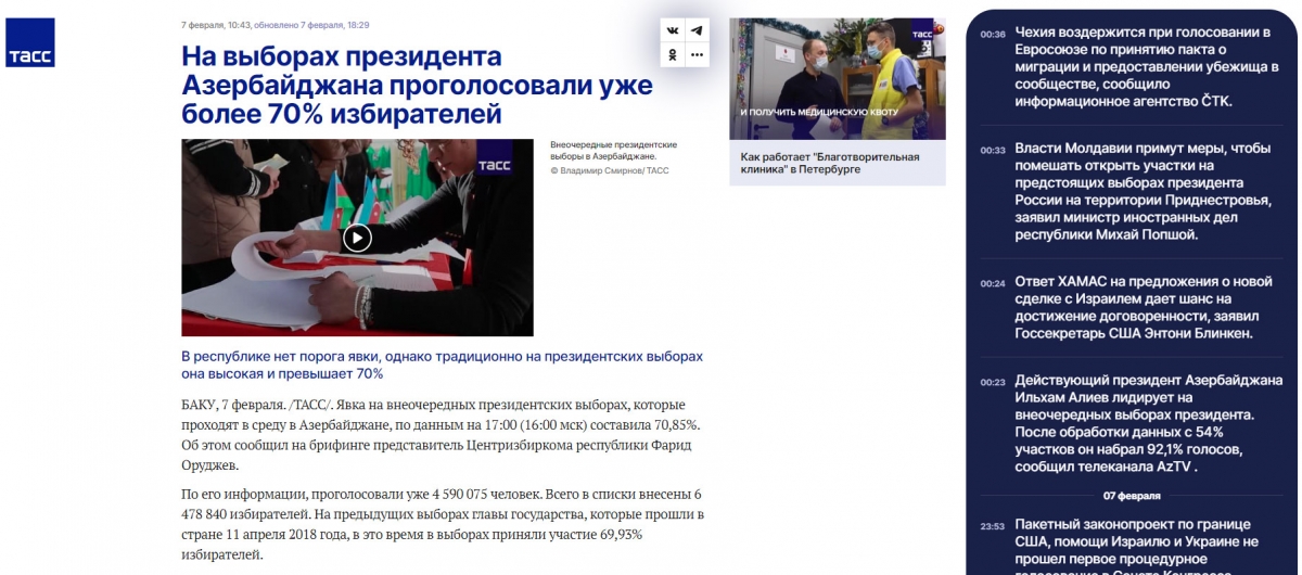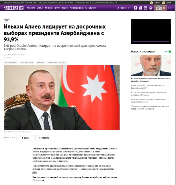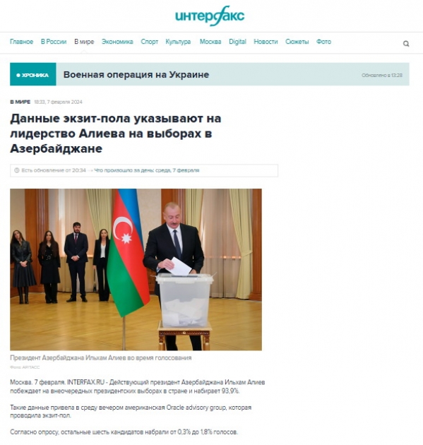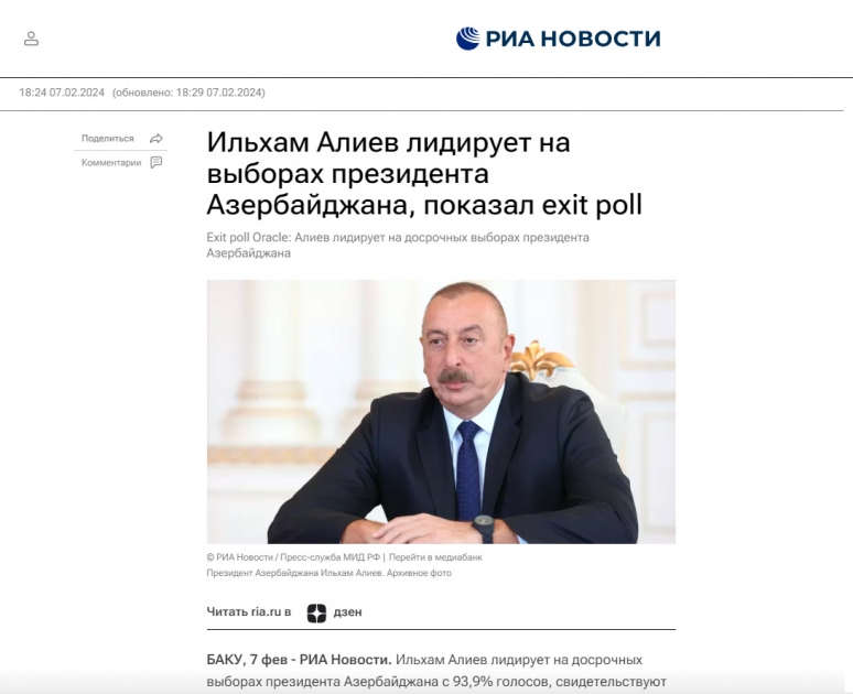 Rusiyanın TASS, “İzvestiya”, RBK, “Vedomosti”, “İnterfaks”, “Nezavisimaya qazeta”, “Komsomolskaya Pravda”, “Arqumentı i faktı”, “Rossiyskaya qazeta”, “Qazeta.ru” media orqanlarında “exit-poll” məlumatlarına əsasən qeyd olunur ki, Prezident İlham Əliyev seçkilərdə 93,9 faiz səslə liderdir. Eyni zamanda bildirilir ki, prezident seçkiləri ölkənin bütün ərazisini, o cümlədən 26 seçki məntəqəsinin açıldığı Qarabağı da əhatə edir. Ölkə böyük dəyişikliklərdən sonra yaranmış şəraitdə növbədənkənar seçkilər keçirir. Prezident İlham Əliyev özü və ailə üzvləri Xankəndidə səs verib.