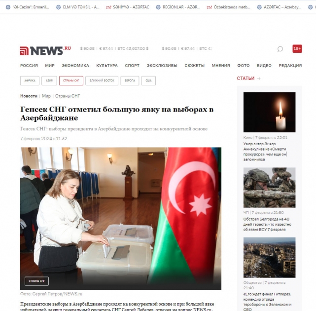 “TASS” Agentliyinin baş direktorunun birinci müavini və MDB-dən olan müşahidəçi Mixail Qusman “NEWS.ru” saytına bildirib ki, Azərbaycanda keçirilən növbədənkənar prezident seçkiləri əvvəlkilərdən yüksək seçici fəallığı ilə fərqlənir. O əlavə edib ki, respublika üçün Qələbə ilə başa çatan müharibə nəticəsində Azərbaycan bu gün ərazisi işğal altında olmayan bir ölkədir. Bu fakt insanların seçkilərdə ruh yüksəkliyinə ciddi təsir edib.