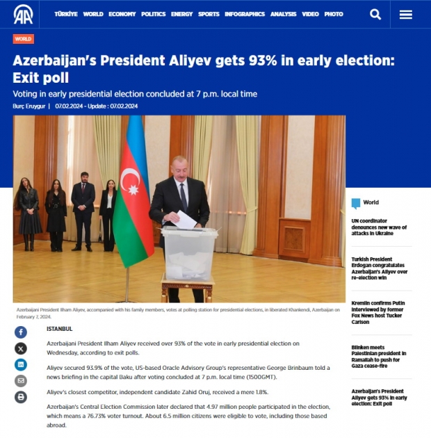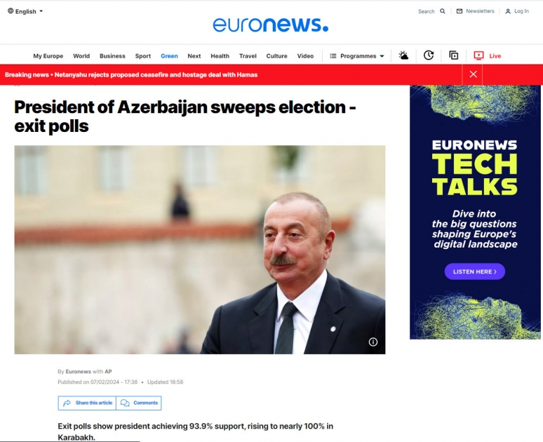 “Euronews” kanalı “exit-poll” məlumatlarına əsasən yayımlanan təcili xəbərində qeyd edib ki, İlham Əliyev təxminən 94 faiz səs toplayaraq seçkilərdə qalib gəlir, onun Qarabağda nüfuzu isə 100 faizə yaxındır.