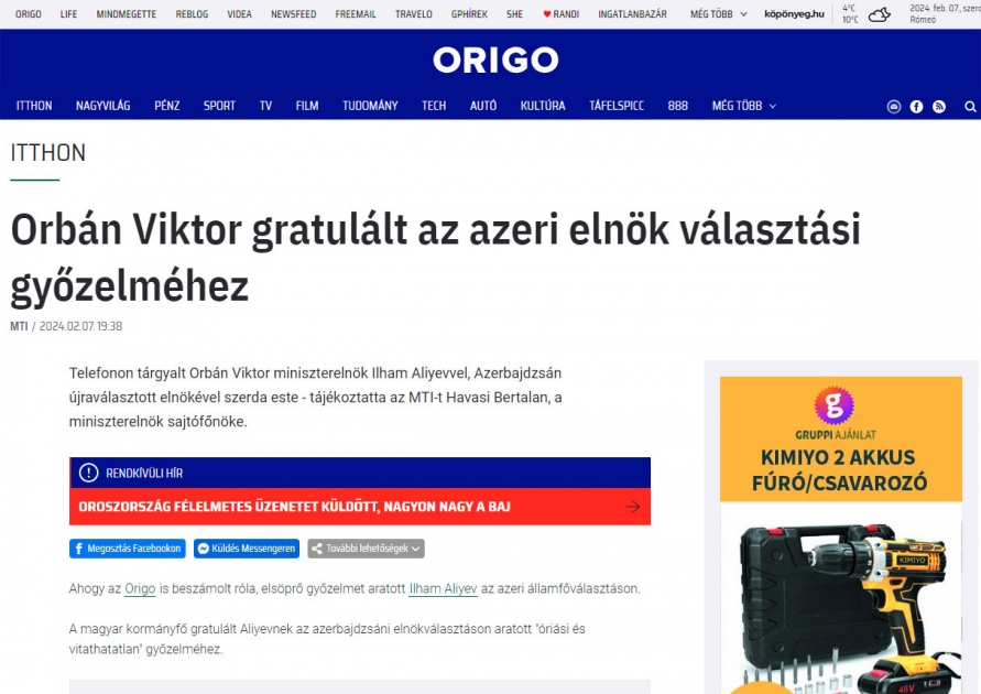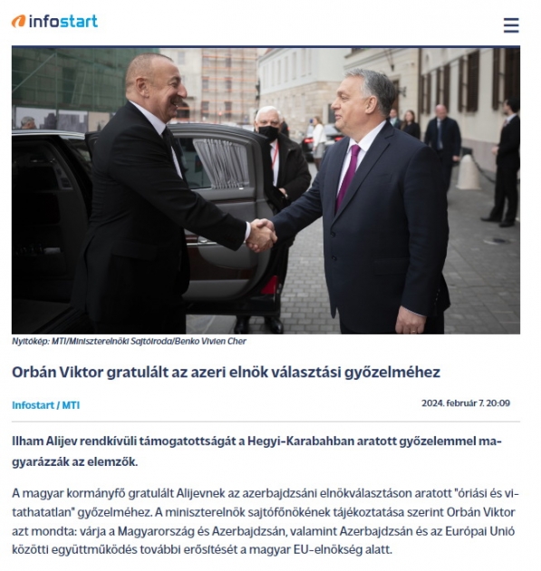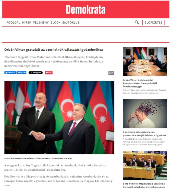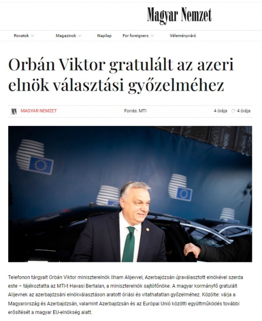 AZƏRTAC xəbər verir ki, Prezident İlham Əliyevin seçkilərdə inamlı qələbəsi haqqında operativ xəbərlər Türkiyənin Anadolu İnformasiya Agentliyində, Macarıstanın ingilisdilli xəbər portalı “Daily News Hungary”, “Origo”, “Magyar Nemzet”, “Demokrata” və digər mətbuat orqanlarında yayılıb. Beynəlxalq internet nəşri olan “Breaking News Network Worldwide” isə “Azərbaycanda seçkilərdə yüksək seçici fəallığı: xalq üçün qələbə” sərlövhəsi ilə məqalə dərc edib.
