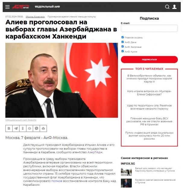 Digər materiallarda bildirilir ki, fevralın 7-də Azərbaycan Prezidenti İlham Əliyev, birinci xanım Mehriban Əliyeva və ailə üzvləri Xankəndi şəhərində 122 saylı seçki dairəsinin 14 saylı məntəqəsində səs veriblər. Bu şəhərdə ötən ilin noyabrında Vətən müharibəsinin üçüncü ildönümünə həsr olunmuş hərbi parad keçirilib. “Associated Press” yazır ki, bu paradda çıxış edən Prezident deyib: “Biz Azərbaycan xalqının gücünü, iradəsini və əyilməz ruhunu bütün dünyaya göstərdik”.