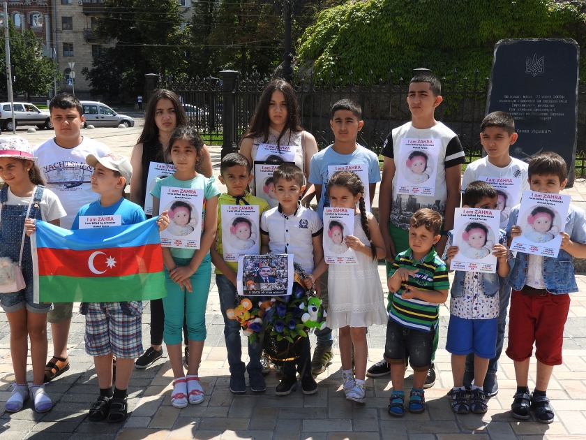 Bundan sonra azərbaycanlı uşaqlar Ermənistanın Ukraynadakı səfirliyinin binasına gələrək üzərində iki yaşlı Zəhranın fotosu və uşaq oyuncaqları olan qara əklili işğalçı ölkənin diplomatik nümayəndəliyinin qarşısına qoyublar.