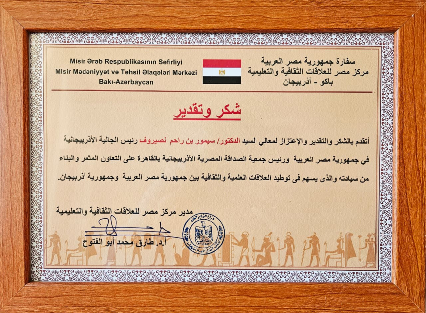 Azərbaycanlı tədqiqatçı-alim Seymur Nəsirov Misir Ərəb Respublikası ilə Azərbaycan Respublikası arasında elmi-mədəni əlaqələrin inkişafında xidmətlərinə görə Misir Təhsil Nazirliyinin medalı ilə təltif olunub.