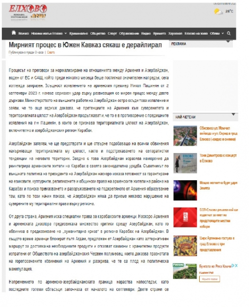 Ermənistanın Azərbaycanla cari sülh prosesini pozmağa və vəziyyəti gərginləşdirməyə yönəlmiş təxribatları ilə bağlı məlumatlar Bolqarıstan mətbuatında geniş işıqlandırılıb.