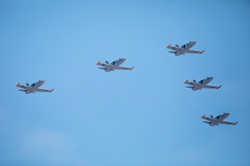 Daha sonra polkovnik-leytenant Aslan Ramazanovun başçılığı ilə “MFİ-17” təlim təyyarələrinin beşliyi səmada dövrə vurub. Ardınca “L-39” təlim təyyarələrinin beşliyi klin düzülüşündə nümayişini davam etdirib. Qrupun rəhbəri “Vətənə xidmətə görə” ordenli polkovnik Əliyar Əsgərov olub. “İL-76” hərbi-nəqliyyat və silahlanmaya yeni qəbul edilmiş “C-27J” yük təyyarələrindən ibarət üçlüyü polkovnik-leytenant Zəfər Fərhadov, “Rəşadət” ordenli polkovnik Ruslan Ələkbərov və “Qarabağ” ordenli polkovnik Vüqar Salahov idarə ediblər. Silahlanmaya yeni daxil olan “JF-17” çoxməqsədli qırıcı təyyarələrinin beşliyi də klin düzülüşündə nümayişini davam etdirib. Qrupa “Vətənə xidmətə görə” ordenli polkovnik Novruz Tahirov başçılıq edib. Türkiyə Hərbi Hava Qüvvələrini təmsil edən “F-16” çoxməqsədli qırıcı təyyarələr beşliyi Bakı səmasında peşəkar uçuş nümayiş etdirib. Beşliyə Albay Nevzat Oflamaz başçılıq edib. Təkmilləşdirilmiş “SU-25-Laçın” hücum təyyarələri beşliyinin başçısı “Qarabağ” ordenli general-mayor Həsən Əlövsədov, 2-ci pilotu isə “Vətənə xidmətə görə” ordenli polkovnik Anar Həsənov olub. Sonuncu - Azərbaycanın Dövlət Bayrağının rənglərini paytaxt səmasında canlandıran “SU-25” hücum təyyarələri qrupuna “Vətənə xidmətə görə” ordenli polkovnik Ruslan Məmmədrzayev başçılıq edib.