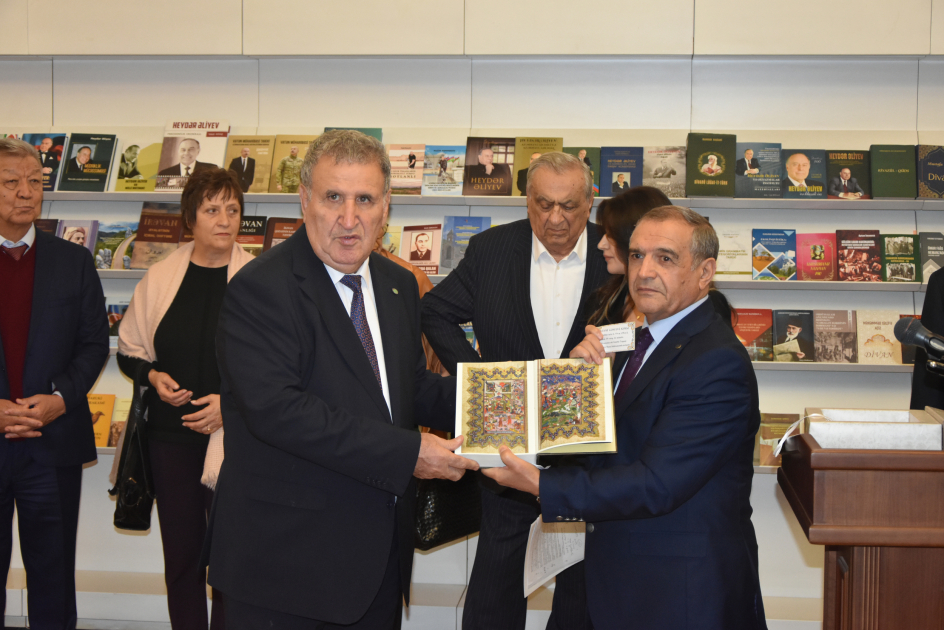 Sonra direktor yubiley münasibətilə klassik Azərbaycan ədəbiyyatının görkəmli nümayəndəsi Nizami Gəncəvinin 1378-ci ildə köçürülmüş “Xəmsə”nin Türkiyənin Topqapı Sarayı Muzeyində saxlanılan nadir nüsxəsinin surətini AMEA-ya hədiyyə edib.