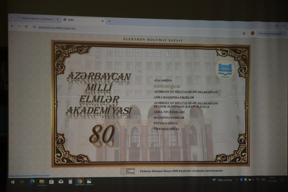 Tədbir çərçivəsində Azərbaycan Milli Kitabxanasının əməkdaşları tərəfindən hazılanan “Azərbaycan Milli Elmlər Akademiyası- 80” adlı elektron məlumat bazasının və virtual sərginin təqdimatı olub.