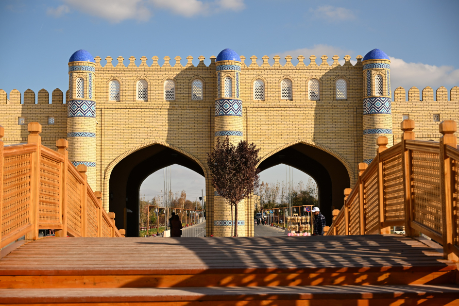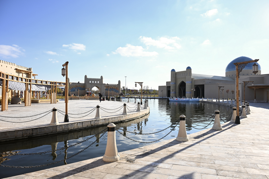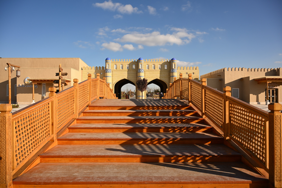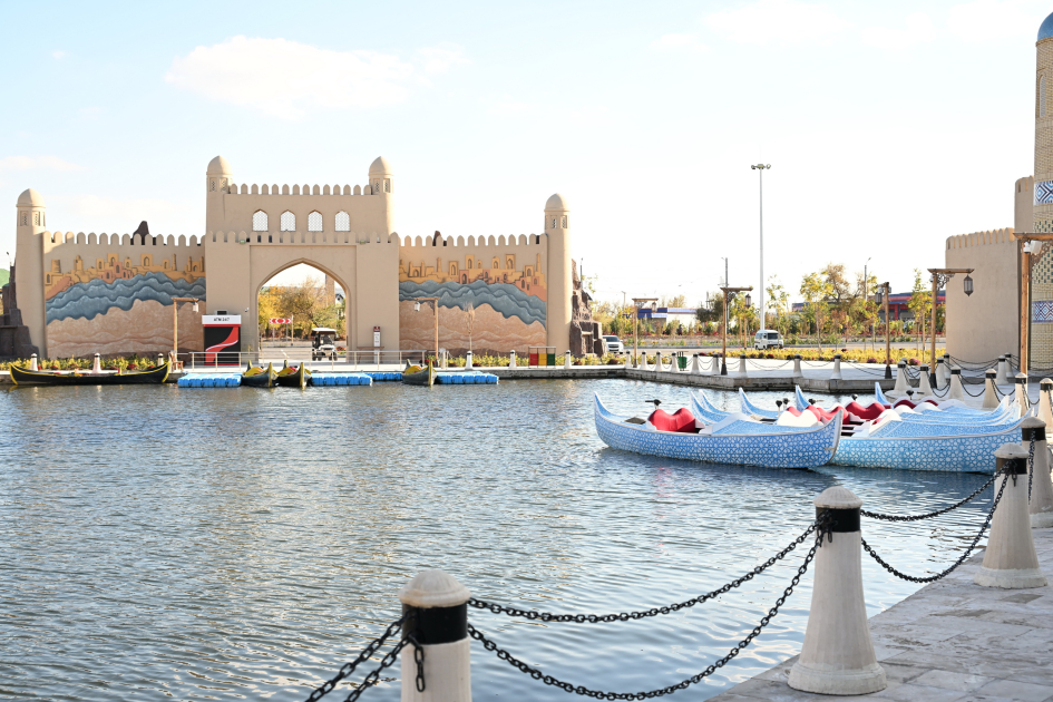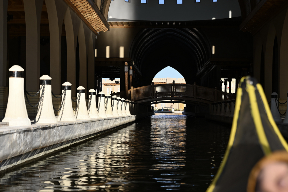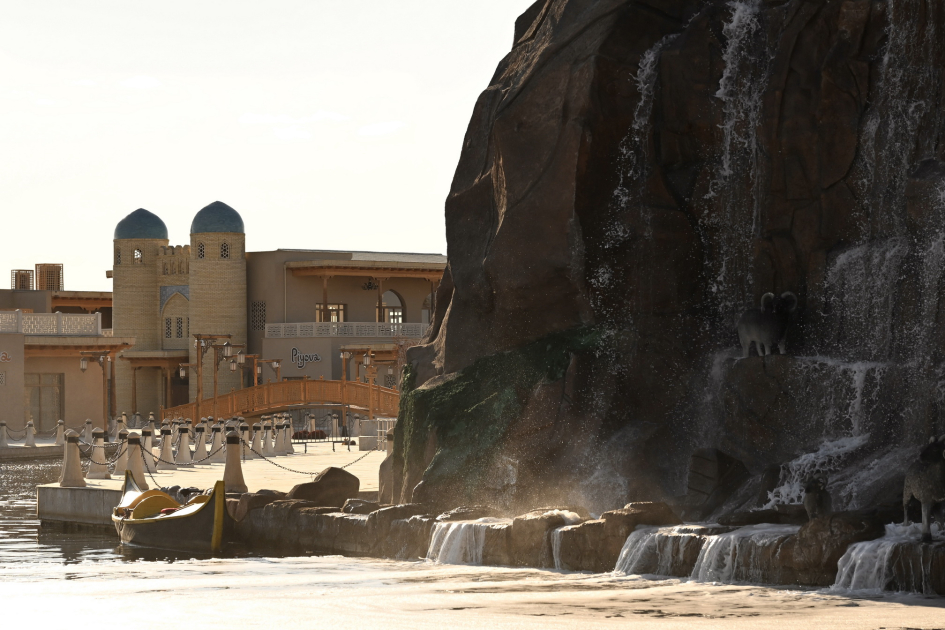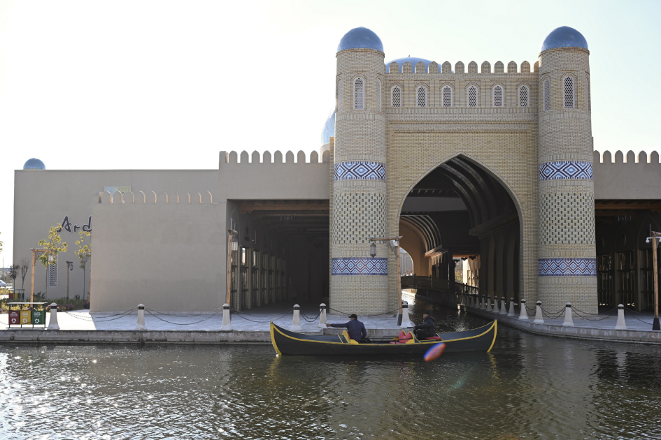Qoş-Darvozanın oyma taxta darvazalarına yaxınlaşanda, sanki kompleksin girişinin məni keçmişə apardığını hiss etdim. “İçəri girəndə özünüzü kiçik bir Xivədə tapırsınız. Kalta-Minor qülləsinin bir nüsxəsi, çoxsaylı orta əsrlər üslublu memarlıq tikililəri, dar küçələr və avarçəkmə kanalları var. Burada qondola gəzintisi Şərq xəyalına, səhranın ortasında kiçik bir Venesiyaya girmək kimidir”, - deyə həmsöhbətimiz izah edir.