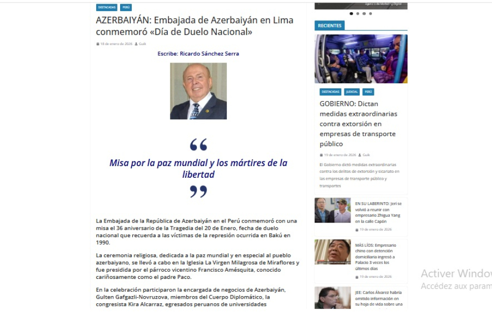 Perunun “GÜİK” qəzetində və “guik.pe” portalında 20 Yanvar faciəsinə həsr edilmiş “Azərbaycan: Limadakı Azərbaycan səfirliyi “Milli Matəm Günü”nü anıb” adlı məqalə dərc olunub.