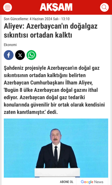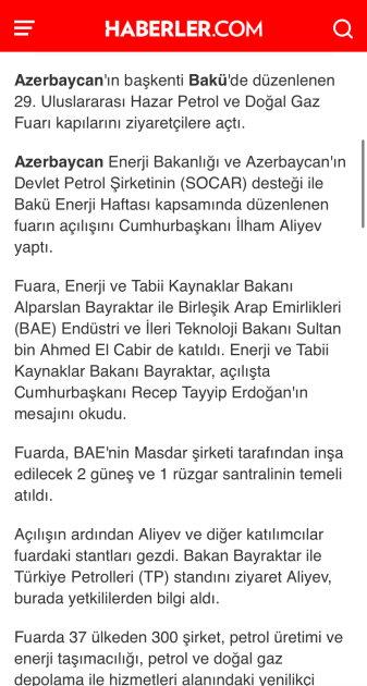 Türkiyə mətbuatında Prezident İlham Əliyevin işğaldan azad edilən ərazilərdə bərpaolunan enerji potensialı barədə fikirləri xüsusilə diqqət mərkəzində saxlanılıb: “2027-ci ilədək 2 qiqavat həcmində bərpaolunan enerjinin əldə edilməsi tamamilə real hədəfdir. Bir daha təkrar edirəm ki, bu, sadəcə, başlanğıcdır”. Bundan başqa, qardaş ölkə mediası dövlətimizin başçısının “Qarabağ və Şərqi Zəngəzurun azad olunmuş ərazilərinin nəhəng hidroelektrik potensialı var. 2020-ci ilin noyabrında həmin ərazilər azad ediləndən sonra orada 270 meqavat həcmində hidroelektrik stansiyalar istifadəyə verilib. 3-5 il ərzində bu rəqəm 500 meqavata çatacaqdır. Beləliklə, bərpaolunan enerjinin 1 qiqavat həcmi bizə yarım milyard kubmetr qaza qənaət etməyə imkan verəcək ki, bazarın bu qaza ehtiyacı var və bu ehtiyac davam edəcəkdir” fikri də oxucuların diqqətinə çatdırılıb.