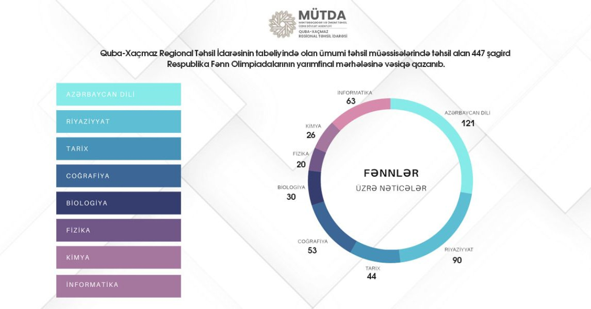 Quba-Xaçmaz Regional Təhsil İdarəsinin tabeliyində olan ümumi təhsil müəssisələrində təhsil alan 447 şagird Respublika Fənn Olimpiadalarının (RFO) yarımfinal mərhələsinə vəsiqə qazanıb.
