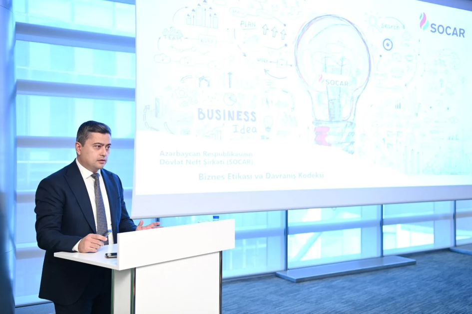 Sonra SOCAR-ın Biznes etikası və anti-korrupsiya şöbəsinin rəisi Teymur Əliyev şirkətin yeni “Biznes etikası və davranış” kodeksindən bəhs edən təqdimatla çıxış edib.