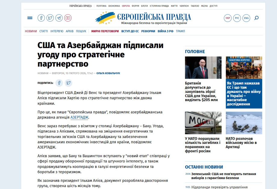 Ukrayna mediası ABŞ-ın Vitse-prezidentinin Azərbaycana səfərinə geniş yer ayırıb