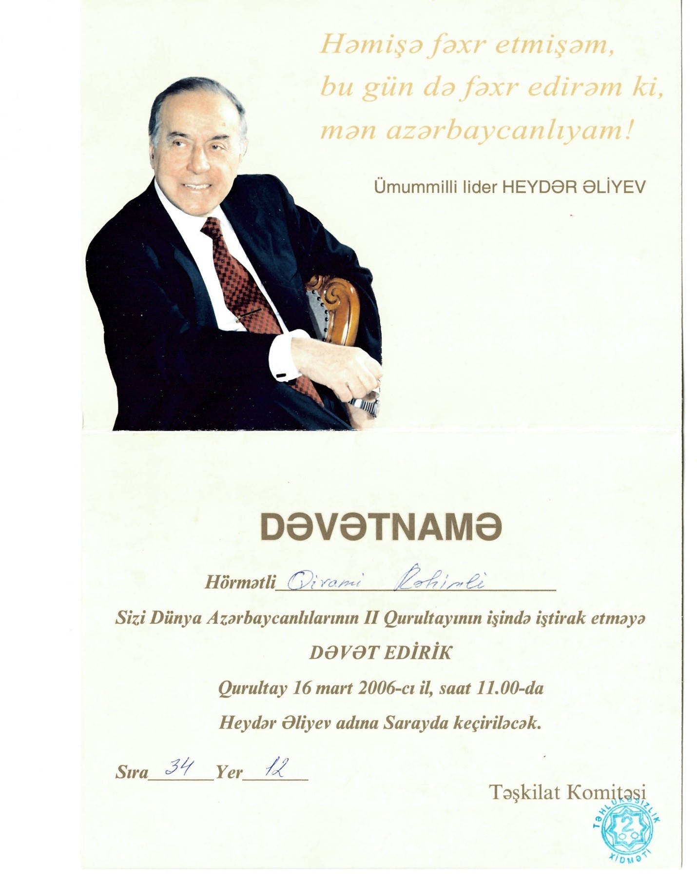 Dünya Azərbaycanlılarının I Qurultayında Heydər Əliyevin səsləndirdiyi məşhur nitq xaricdə yaşayan həmvətənlərimiz üçün tarixi əhəmiyyət daşıdı. Bu böyük şəxsin söylədiyi “Mən həmişə fəxr etmişəm, bu gün də fəxr edirəm ki, mən azərbaycanlıyam” - sözləri bütün azərbaycanlılar üçün unudulmaz və geniş yayılmış bir ifadəyə çevrildi. Siyasi baxışınız necə olursa-olsun, Heydər Əliyevin ölkəmizə və onun hüdudlarından kənarda göstərdiyi təsir inkaredilməzdir.