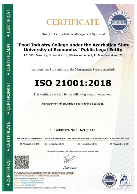 Auditin nəticəsində Qida Sənayesi Kolleci müvafiq beynəlxalq sertifikatlara layiq görülüb.